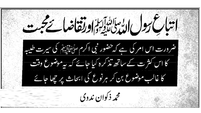 رسول اللہ ﷺ سے محبت ایمان بالرسول کاوہ بدیہی تقاضاہے جو آپ ﷺ کی نسبت سے ایک سچے مومن کے اندر فطری طورپر موج زن ہواکرتا ہے۔ میڈیا سونامی کے اِس دور میں، جب کہ عام طورپر ’بغیرعلمٍ ولاھدیً ولاکتابٍ منیر‘ (الحج، 22: 8) کے مصداق، بہت سے ’مذہبی‘ اور غیر’مذہبی‘ فلسفہ و افکار کی اشاعت دن رات جاری ہے۔ اِس صورت ِ حال میں ضرورت ہے کہ ہر قسم کی گروہ بندی اور مسلک پرستی سے بلند ہوکر رسول اللہ ﷺ سے قلبی تعلق قائم ہو اور ہر جگہ آپ ﷺ کی سیرت اورآپ ﷺ کی تعلیما ت کا اِس کثر ت کے ساتھ تذکرہ کیا جائے کہ وہی وقت کا غالب موضوع بن کر تمام فلسفہ ہاے حیات پر چھاجائے۔