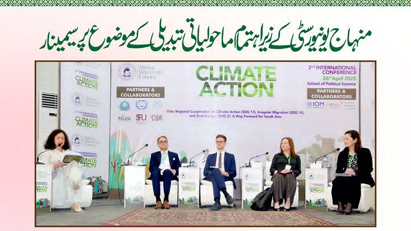 علم و شعور کی روشنی سے جہالت کی تاریکیوں کو چیرنے والا ادارہ، منہاج یونیورسٹی لاہور، ایک بار پھر بین الاقوامی سطح پر فکری ہم آہنگی، ماحولیاتی شعور، انسانی ہمدردی اور عالمگیر ترقی کے اہداف کو یکجا کرنے میں پیش پیش نظر آیا، جب اس کے اسکول آف پولیٹیکل سائنس نے مورخہ 26 اپریل 2025 کو ایک عظیم الشان بین الاقوامی کانفرنس کا انعقاد کیا۔ یہ کانفرنس نہ صرف علمی و فکری مکالمے کا مظہر تھی بلکہ انسانیت کی فلاح، قدرتی وسائل کے تحفظ، اور دنیا کو بھوک، مہاجرت اور ماحولیاتی آلودگی جیسے خطرات سے بچانے کی ایک منظم کوشش بھی۔
