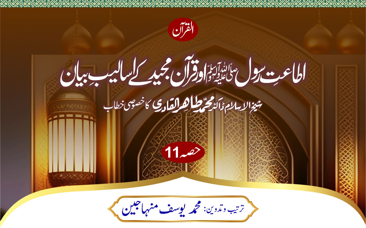 جب ان امور میں اطاعت کا حکم آیا ہے تو اللہ تعالیٰ اور رسول ﷺ دونوں کے لیے ایک ہی مرتبہ أطیعوا وارد ہوا ہے۔ اس سے یہ بات واضح ہو گئی کہ اطاعت کا حکم خواہ اللہ تعالیٰ کے لیے ہو یا رسول ﷺ کے لیے، یہ صرف عبادات کے لیے مختص نہیں ہے بلکہ معاملات، حالتِ امن و جنگ، جنگی قوانین، عامۃ الناس کے مصالح، حقوق اور فرائض و واجبات میں بھی رسول ﷺ کی اطاعت اُسی طرح واجب ہے جیسے اللہ تعالیٰ کی اطاعت واجب ہے۔ حتیٰ کہ جمیع دینی، اخروی اور دنیوی امور میں اللہ تعالیٰ اور اُس کے رسول ﷺ کی اطاعت یکساں واجب ہے اور اُن میں تفریق نہیں کی گئی۔ اگر اس میں تفریق کرنا چاہیں گے تو یہ قرآن مجید پر اپنی عقل اور رائے کو معاذ اللہ غالب کرنا قرار پائے گا اور ایسا کرنا کفر ہے۔