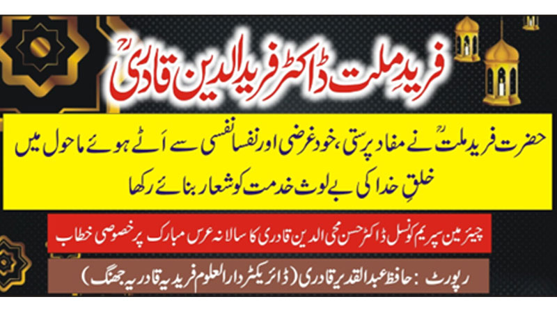 16 شوال المکرم وہ دن ہے جب ایک مردِ قلندر، حق شناس، عشقِ الہٰی و عشقِ رسول ﷺ کا عملی پیکر محسنِ ملت، فریدِ ملتؒ عالم فنا سے بقا کی طرف عازم سفر ہوئے اور واصل حق ہونے کا اعزاز پایا۔ اسی دن آپ کا عرس مبارک آپ کے مزارِ اقدس واقع جھنگ میں نہایت تزک و احتشام سے منایا جاتا ہے۔ چونکہ اب یہ عرس مبارک TMQ کا مرکزی Event بن چکا ہے۔ لہذا مرکز لاہور اور پاکستان کے مختلف شہروں کے علاوہ بیرون ممالک سے بھی زائرین و محبینِ فرید ملتؒ کثیر تعداد میں جوق در جوق عرس مبارک کی تقریبات میں شرکت کے لیے تشریف لاتے ہیں۔